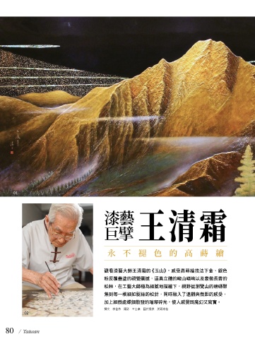 01 漆藝 巨擘王清霜 永不 褪 色 的 高 蒔 繪 ᝈဒᖵɽࢪˮᒲٙ͗ʆdชա৷➼ᖭҦجɨږeვЍ ४ˀᔧᛌ෩ٙൖᙂቤኼd༻ॆͭٙࢡʆ⢸᪹˸ʿᅄڗڡٙ ؒ؍dίʈᖵɽࢪމጰήᖭɨdൖᓭᚎʆٙᆼヌၳ ೊՑӊɓ࣬νቻകٙؒ০dΝࣛፄɝəჃᝈၾฆ൷ٙชաd ̋ɪฆஈᑮཚ೯ٙᆪᐓຟΈdԴɛชᙂ݅ᚭˌɦᄳྼf ᅠ˖ķҽԳٹ ᙲᅂķˮɻႴ ྡ˪Զķߕဒᖵ 02 80 / Taiwan